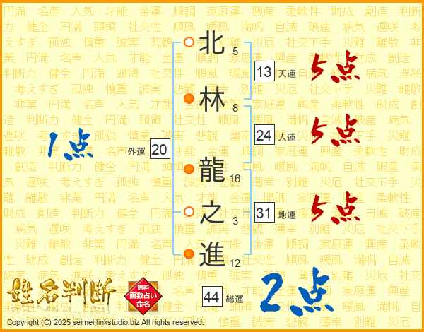 北(5画)林(8画) 龍(16画)之(3画)進(12画)
