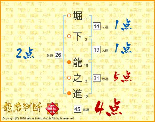 堀(11画)下(3画) 龍(16画)之(3画)進(12画)