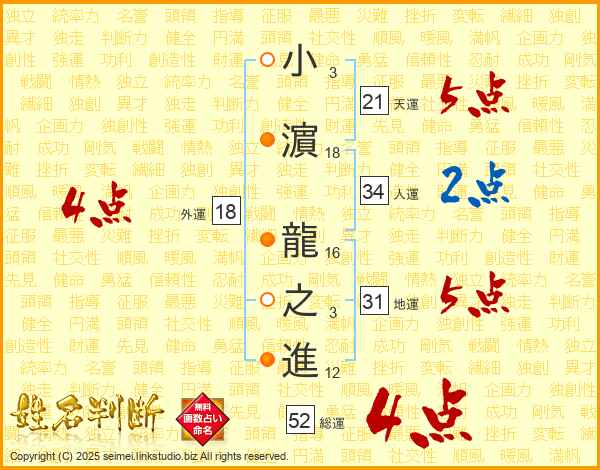 小(3画)濵(18画) 龍(16画)之(3画)進(12画)