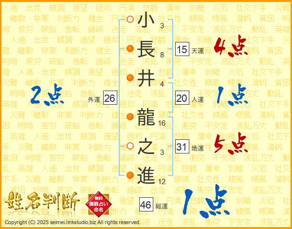 小(3画)長(8画)井(4画) 龍(16画)之(3画)進(12画)