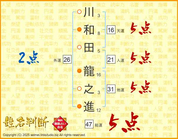 川和田龍之進さんの総運は47画の5点!