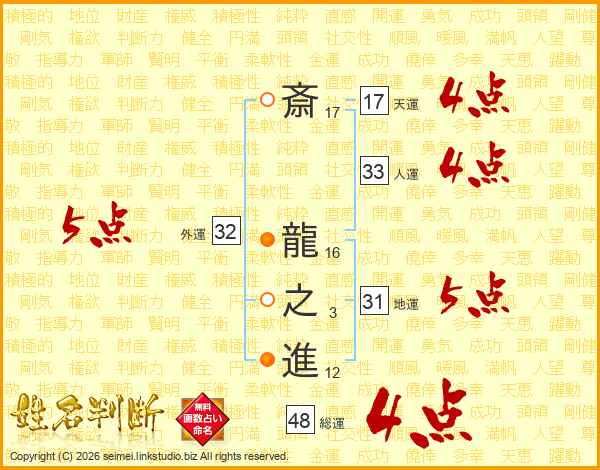 斎龍之進さんの人運は33画の4点!
