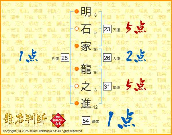 明(8画)石(5画)家(10画) 龍(16画)之(3画)進(12画)
