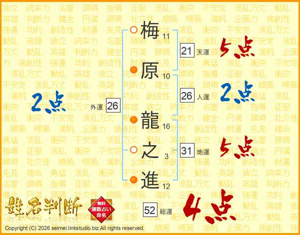 梅(11画)原(10画) 龍(16画)之(3画)進(12画)
