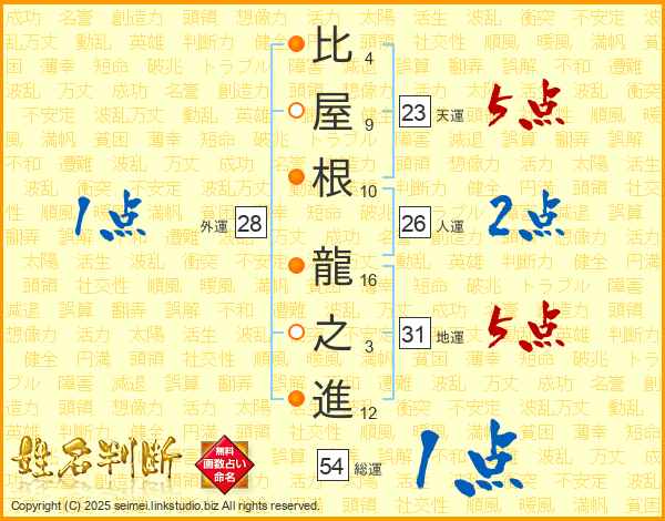 比(4画)屋(9画)根(10画) 龍(16画)之(3画)進(12画)