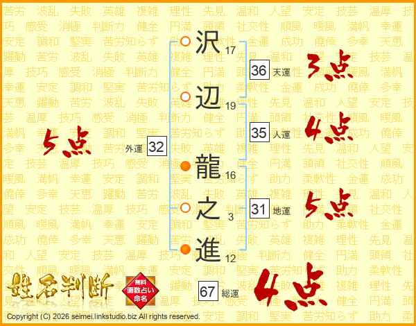 沢辺龍之進さんの総運は67画の4点!