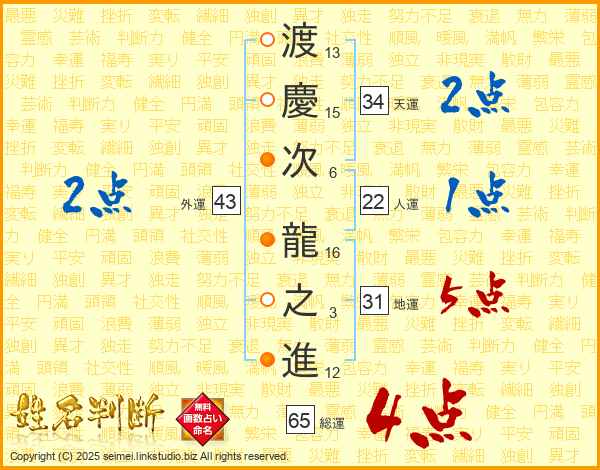 渡慶次龍之進さんの総運は65画の4点!