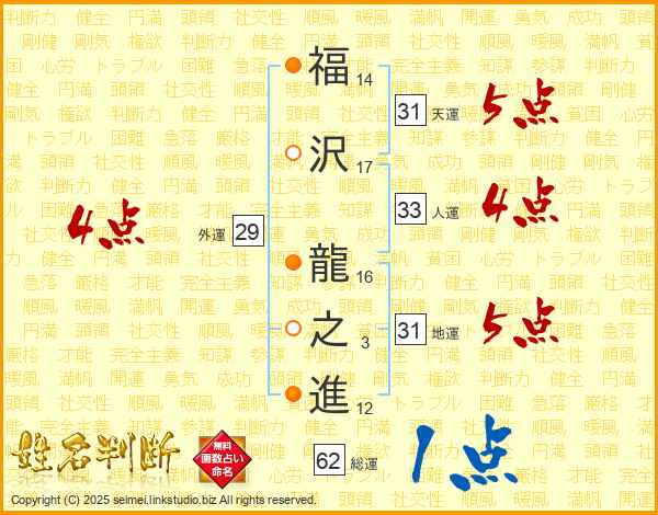 福(14画)沢(17画) 龍(16画)之(3画)進(12画)