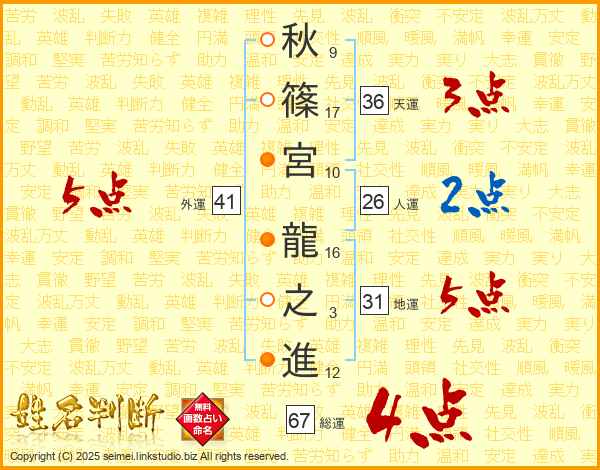秋(9画)篠(17画)宮(10画) 龍(16画)之(3画)進(12画)