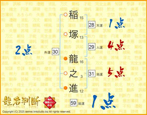 稲(15画)塚(13画) 龍(16画)之(3画)進(12画)