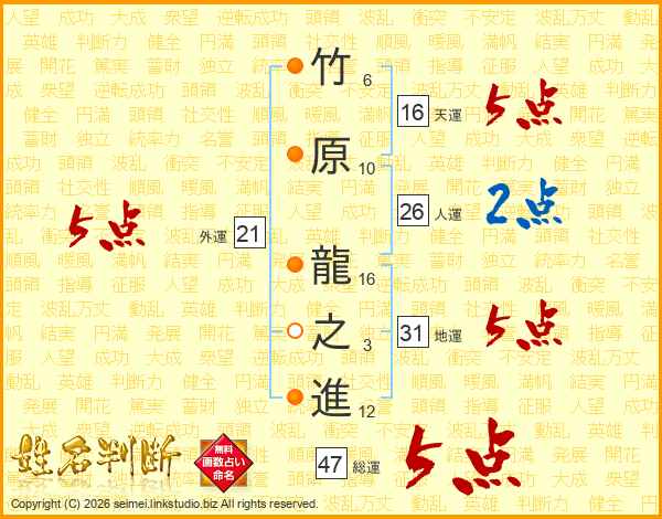 竹原龍之進さんの総運は47画の5点!