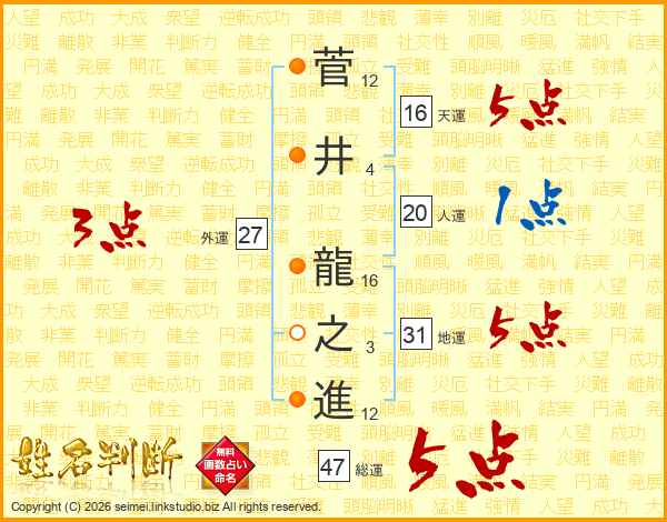 菅井龍之進さんの総運は47画の5点!