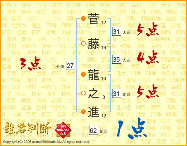 菅(12画)藤(19画) 龍(16画)之(3画)進(12画)