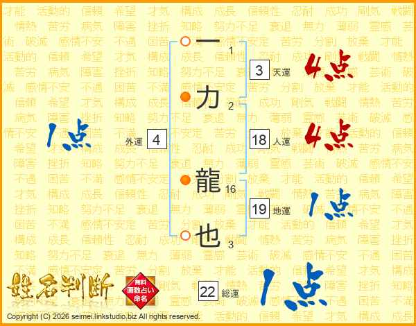 生活面を象徴する運勢です。外部から受ける影響力を表し、結婚運、家庭運や職場、環境への順応性を表します。総運から人運を引いた画数。姓や名が1文字の場合を除く。