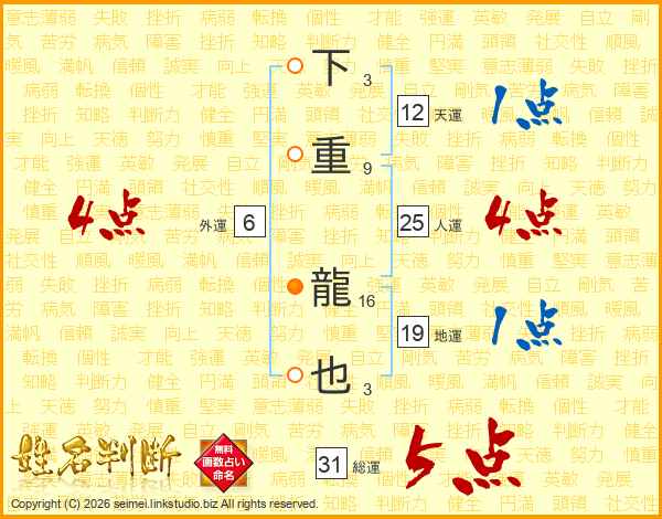 生活面を象徴する運勢です。外部から受ける影響力を表し、結婚運、家庭運や職場、環境への順応性を表します。総運から人運を引いた画数。姓や名が1文字の場合を除く。