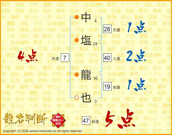 中塩龍也さんの総運は47画の5点!