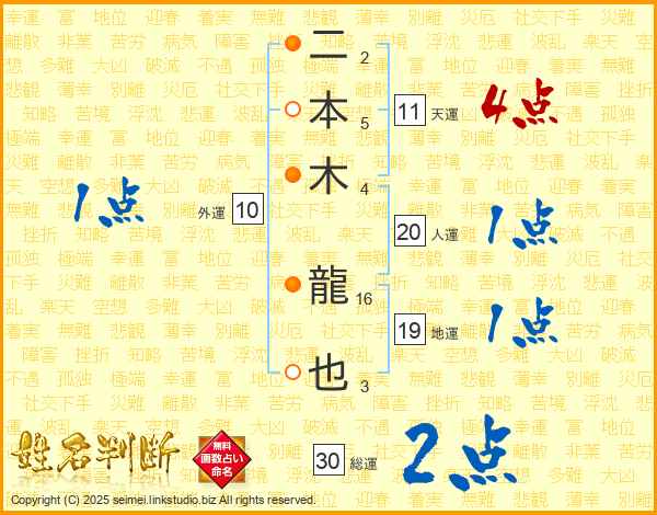 二(2画)本(5画)木(4画) 龍(16画)也(3画)