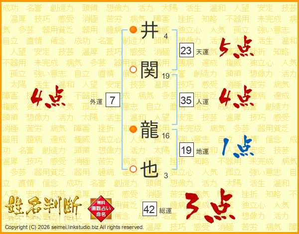 井(4画)関(19画) 龍(16画)也(3画)
