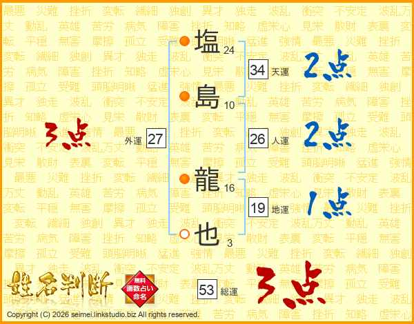 生活面を象徴する運勢です。外部から受ける影響力を表し、結婚運、家庭運や職場、環境への順応性を表します。総運から人運を引いた画数。姓や名が1文字の場合を除く。