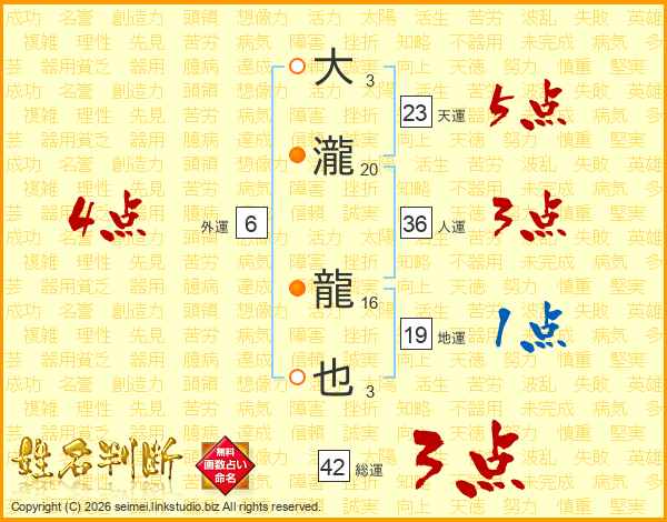 大(3画)瀧(20画) 龍(16画)也(3画)