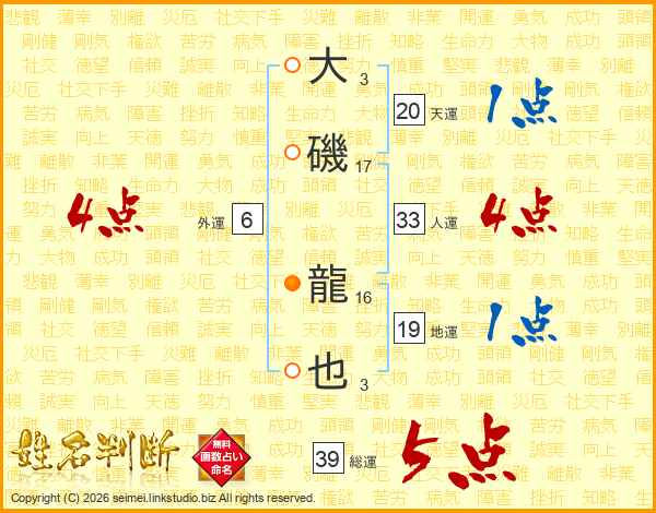 大磯龍也さんの総運は39画の5点!