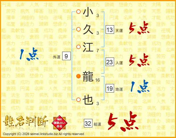 小(3画)久(3画)江(7画) 龍(16画)也(3画)