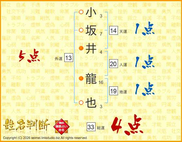 小坂井龍也さんの総運は33画の4点!