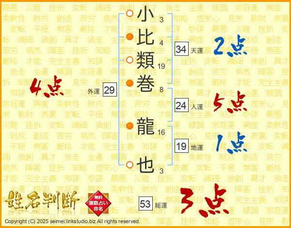 小比類巻龍也さんの総運は53画の3点!