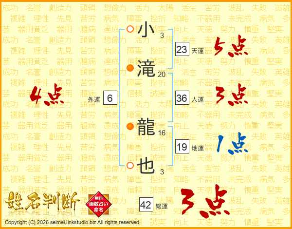 生活面を象徴する運勢です。外部から受ける影響力を表し、結婚運、家庭運や職場、環境への順応性を表します。総運から人運を引いた画数。姓や名が1文字の場合を除く。