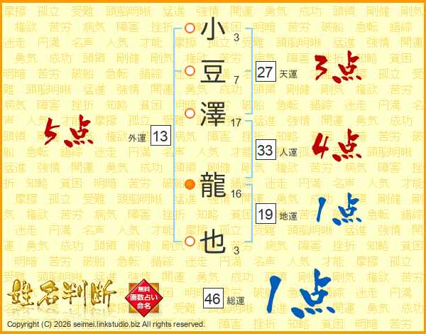 小豆澤龍也さんの総運は46画の1点!