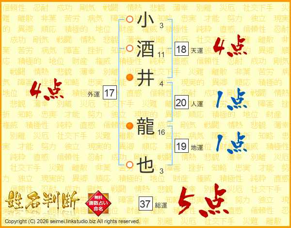 小酒井龍也さんの総運は37画の5点!