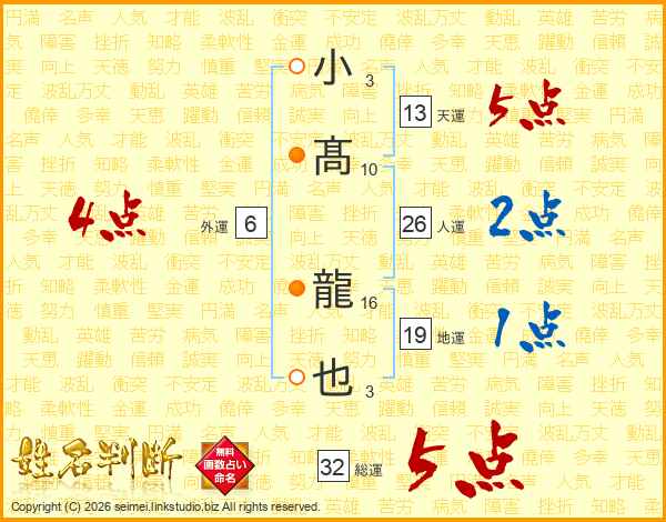 小髙龍也さんの総運は32画の5点!