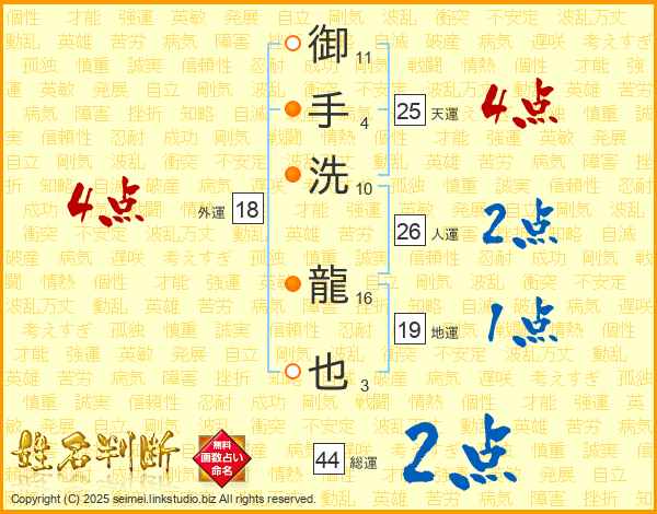 御手洗龍也さんの総運は44画の2点!