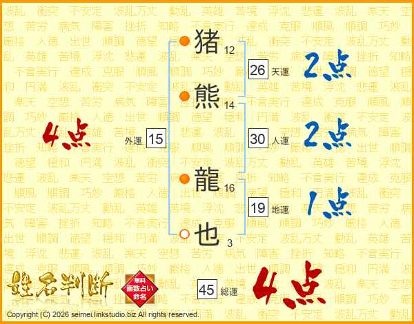 猪熊龍也さんの総運は45画の4点!