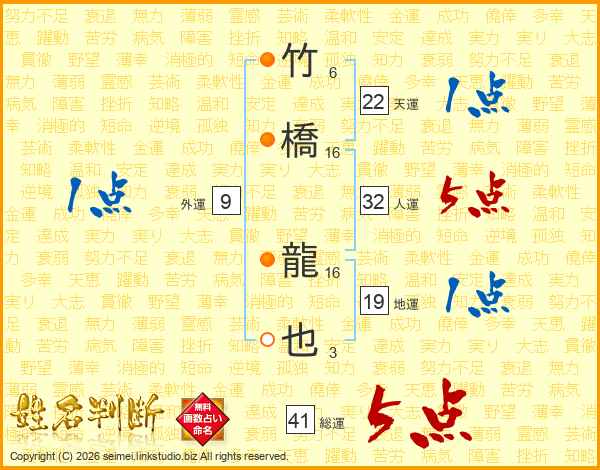 竹(6画)橋(16画) 龍(16画)也(3画)