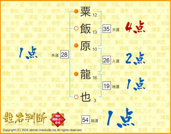 粟飯原龍也さんの総運は54画の1点!