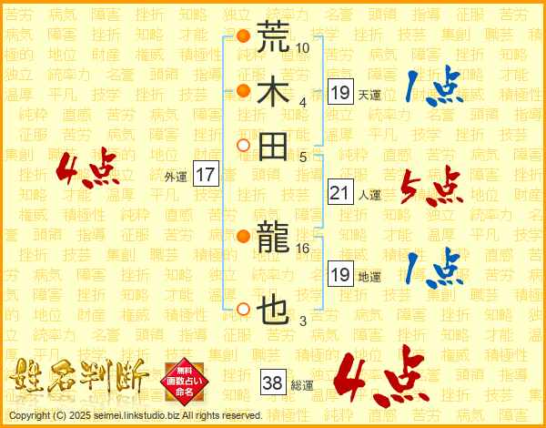 荒(10画)木(4画)田(5画) 龍(16画)也(3画)