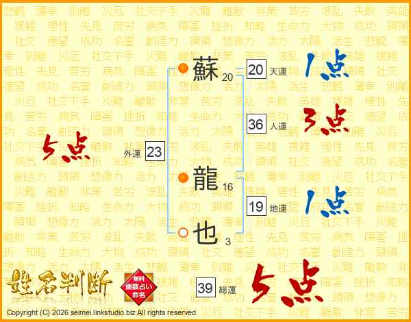 あなたの人生を表す1番重要な運勢です。生涯を通じて影響する総合運となり、主に50歳以降の晩年期に影響を及ぼします。苗字と名前の合計画数。
