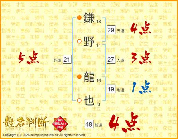 鎌野龍也さんの総運は48画の4点!