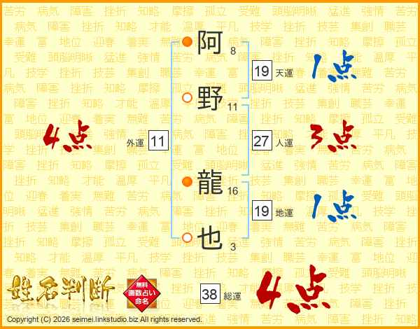 阿野龍也さんの総運は38画の4点!
