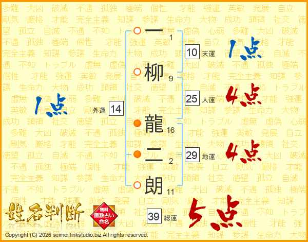 一(1画)柳(9画) 龍(16画)二(2画)朗(11画)