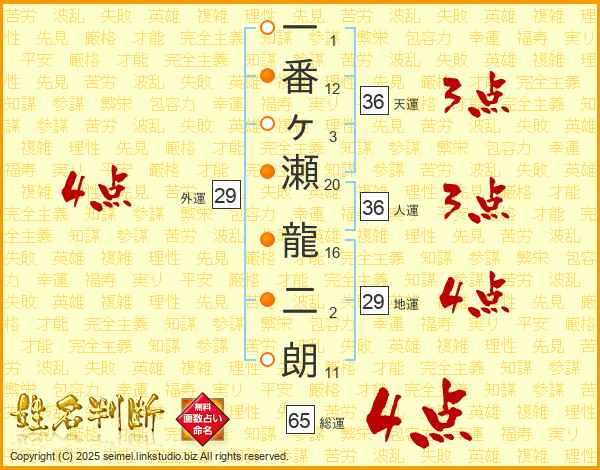 一番ヶ瀬龍二朗さんの総運は65画の4点!