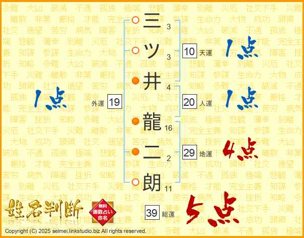 三ツ井龍二朗さんの総運は39画の5点!