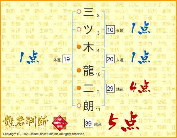三(3画)ツ(3画)木(4画) 龍(16画)二(2画)朗(11画)