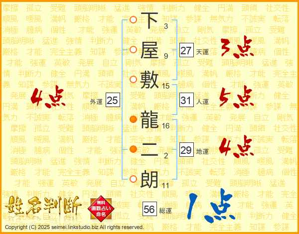 下(3画)屋(9画)敷(15画) 龍(16画)二(2画)朗(11画)