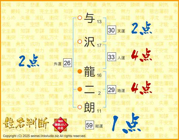 与沢龍二朗さんの人運は33画の4点!