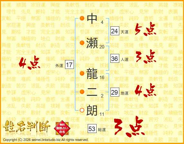 中(4画)瀬(20画) 龍(16画)二(2画)朗(11画)