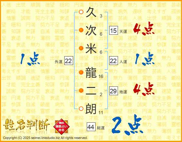 久(3画)次(6画)米(6画) 龍(16画)二(2画)朗(11画)