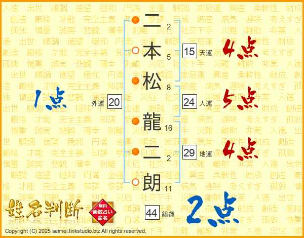 二(2画)本(5画)松(8画) 龍(16画)二(2画)朗(11画)
