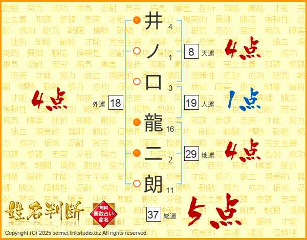 井(4画)ノ(1画)口(3画) 龍(16画)二(2画)朗(11画)